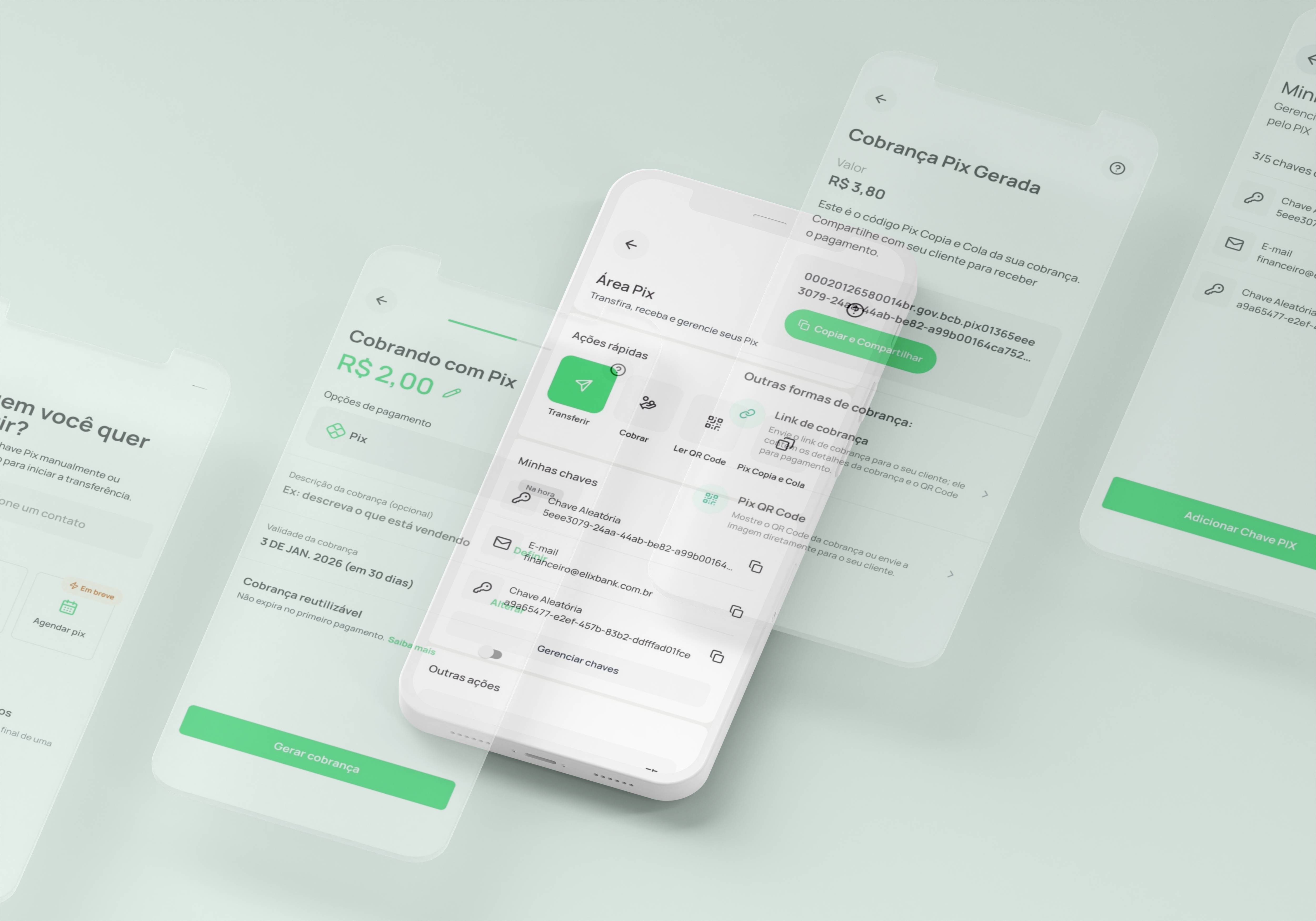 A complete Pix payments experience: send, receive, Pix Copy & Paste, scheduling, QR codes, and integration with charges and payment links for businesses.